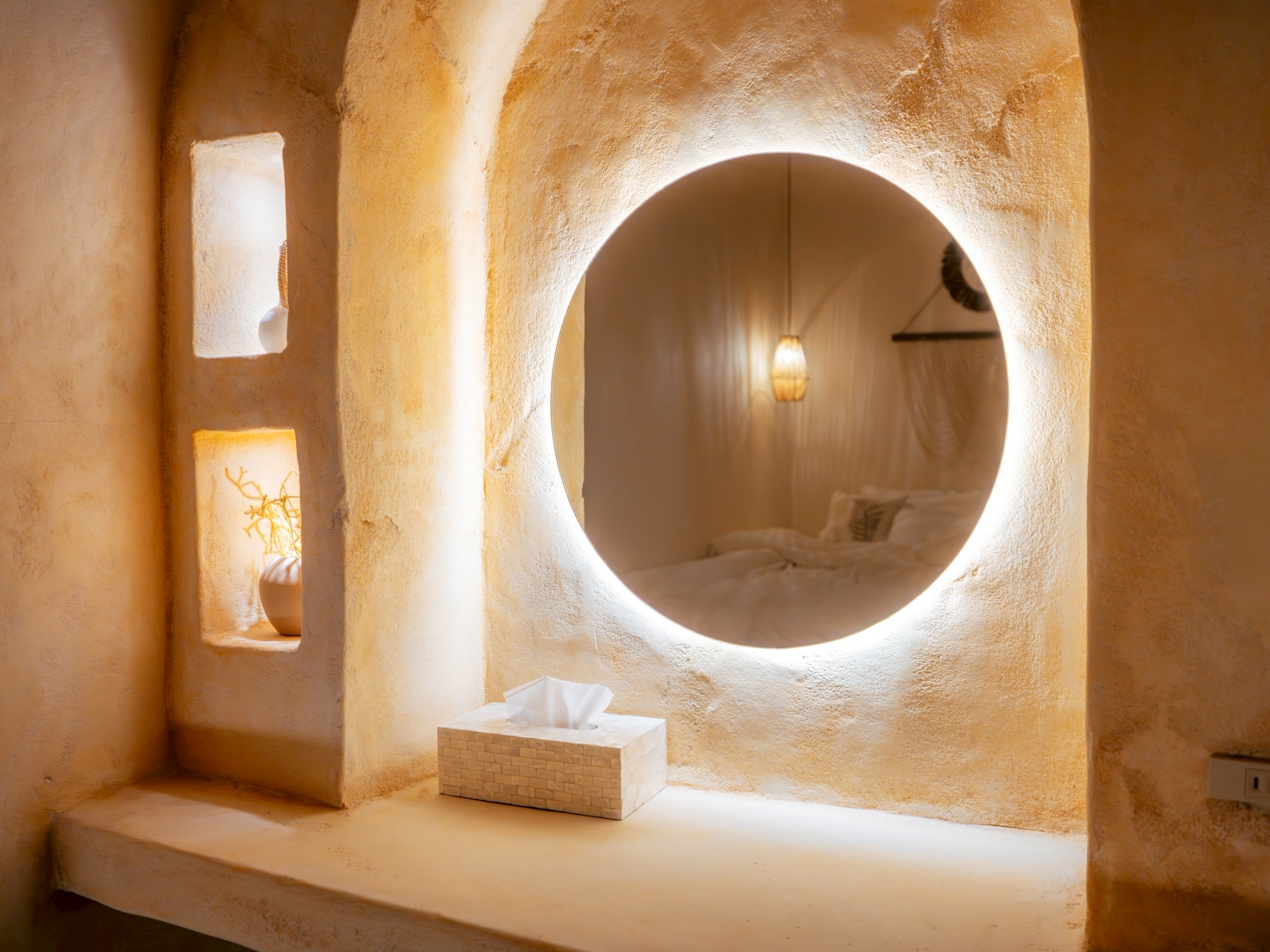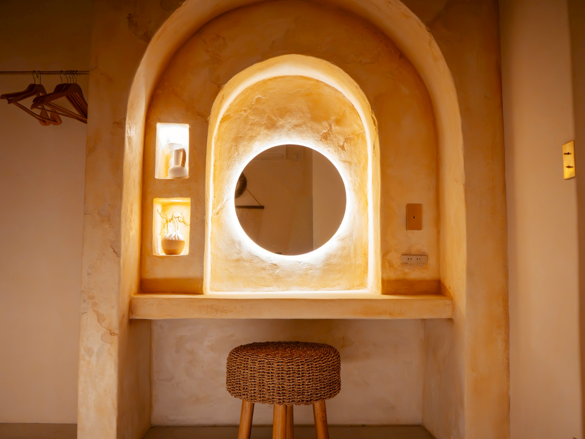 寝室のドレッサーは、世界初とも言える2重のアーチを取り入れた完全オリジナルのデザイン『ダブルニッチ』。プラスター風のモルタル造形によって、洞窟のような没入感のある雰囲気。まるで海外リゾートの一角にいるかのような特別な空間に仕上げました。