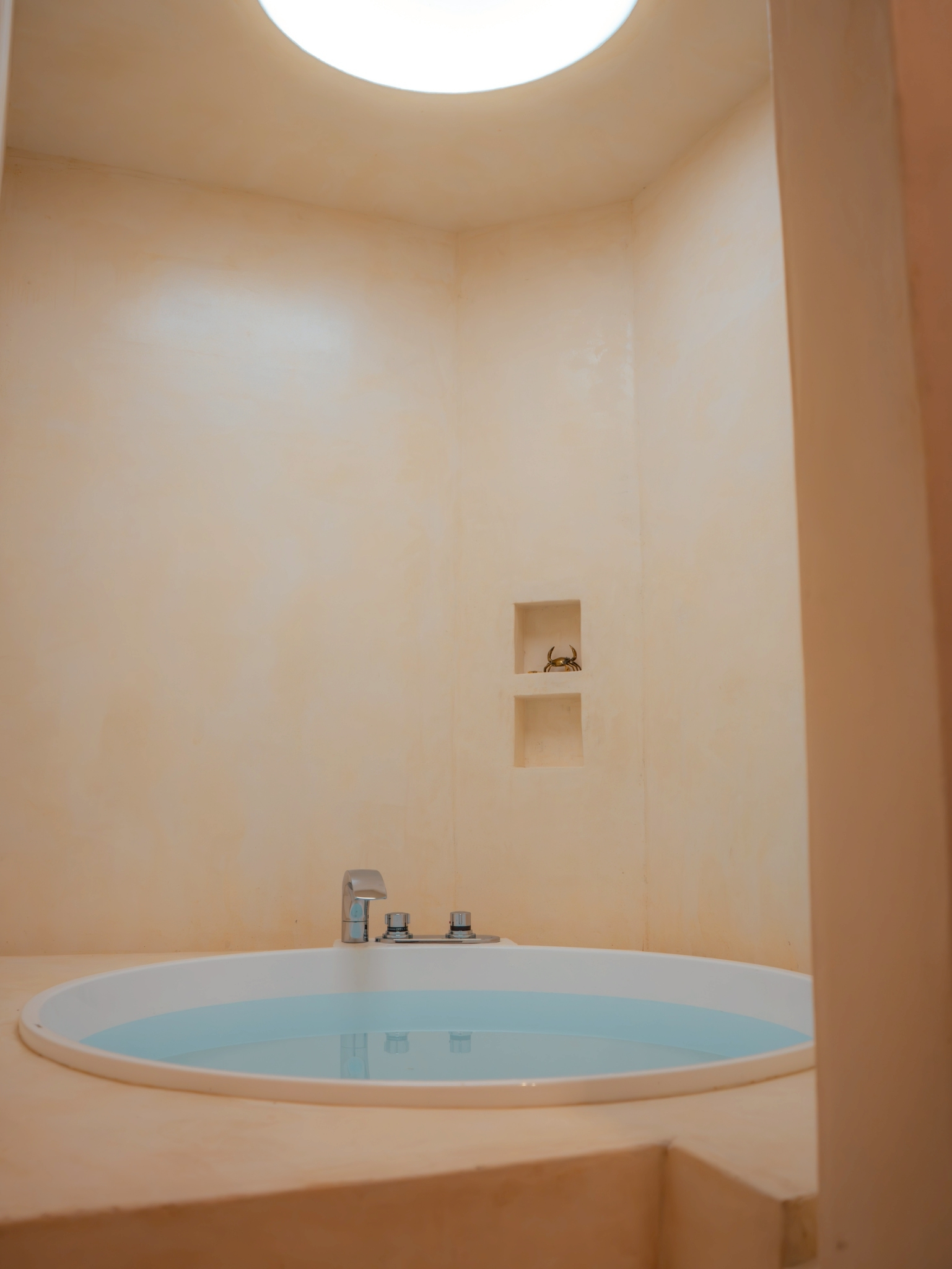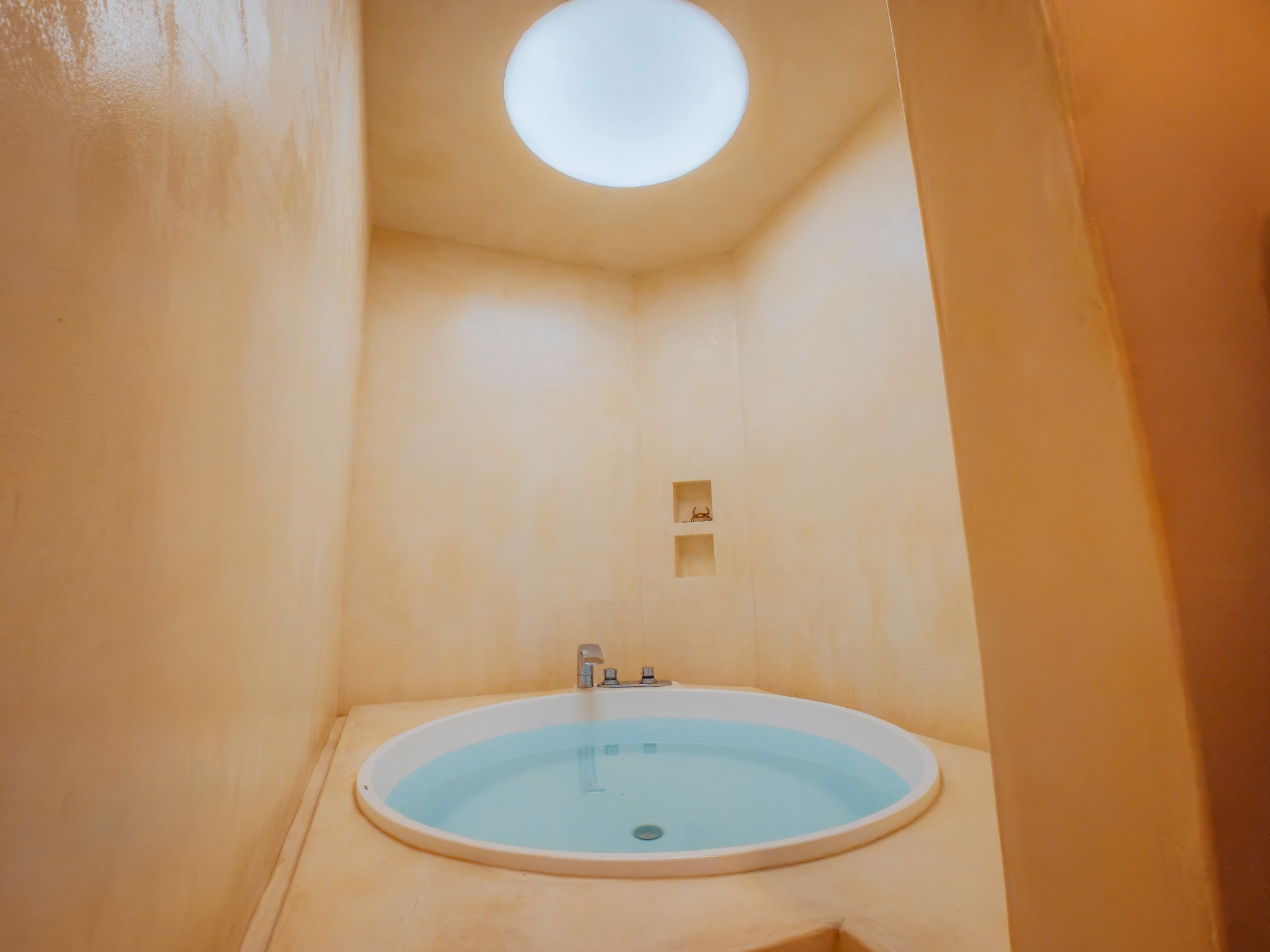埋め込みの円形バスタブを採用したバスルーム。天井、壁ともに左官仕上げで。ほんの少し赤みを加えてサンセットを感じさせるようなサンドベージュに。