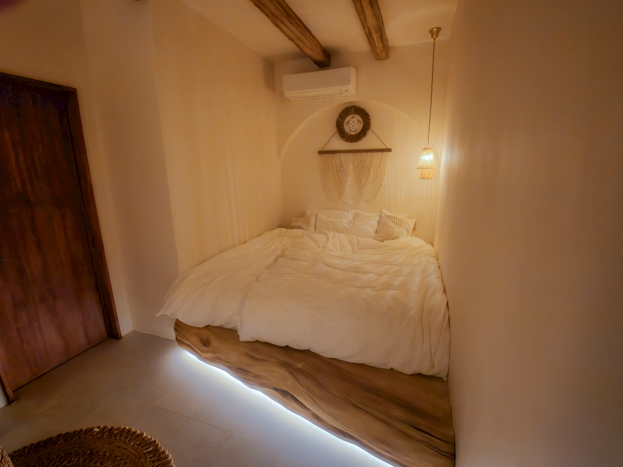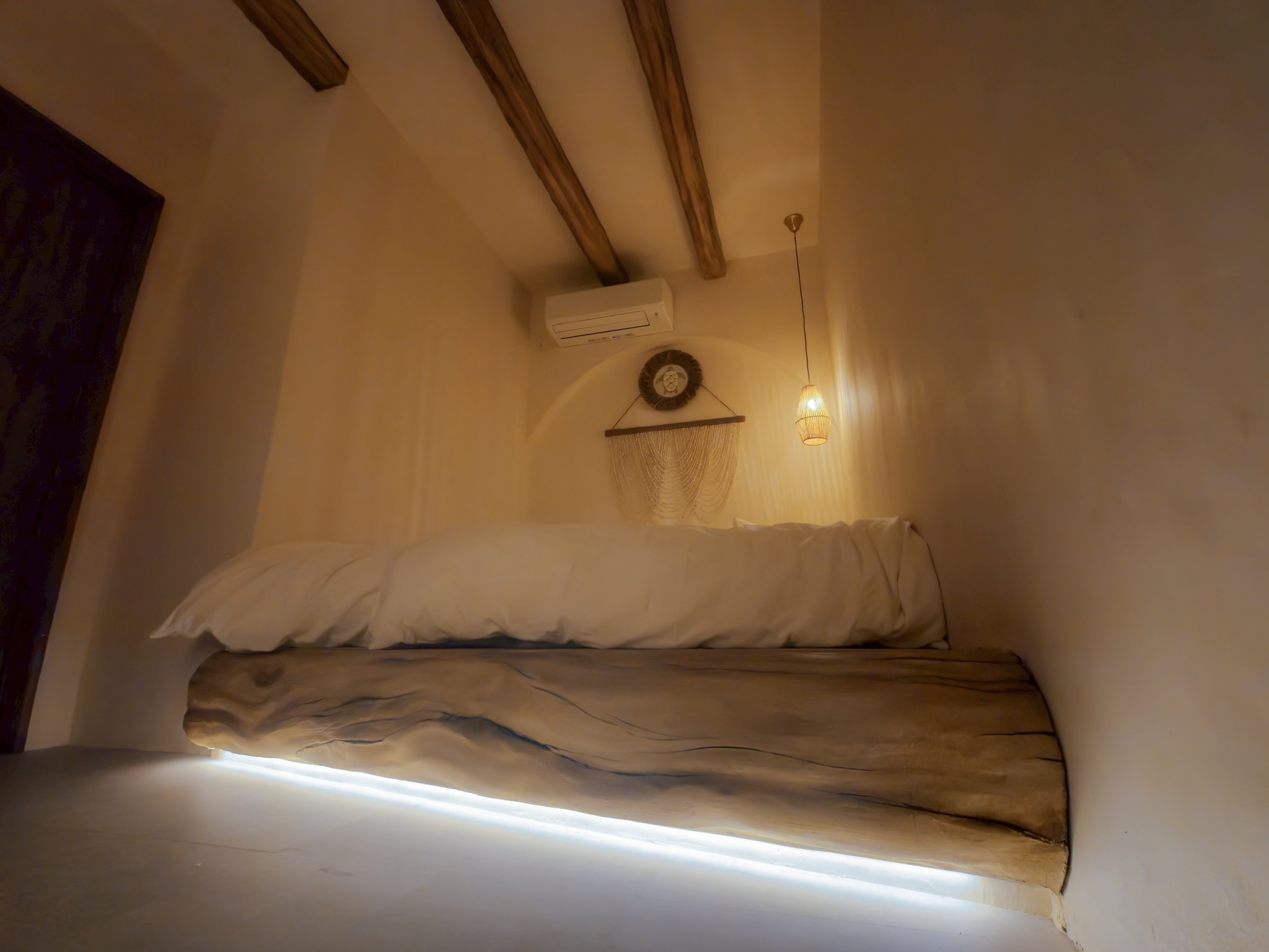 天井の梁とベッドフレームは、職人による擬木のモルタル造形です。間接照明が柔らかく足元を照らします。